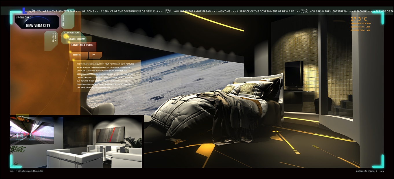 Looks like someone might be planning a vacation or maybe just wishful thinking. A Panorama Suite at New Vega City is a pricey destination. The view is to die for and there is plenty of space, even a living area. The hull of NVC is fixed to insure continuous artificial gravity, but interior walls, as will all programmable architecture, can come and go, become transparent or active for immersible experiences. Even the shower can become part of the living room entertainment. So much to do in the future.