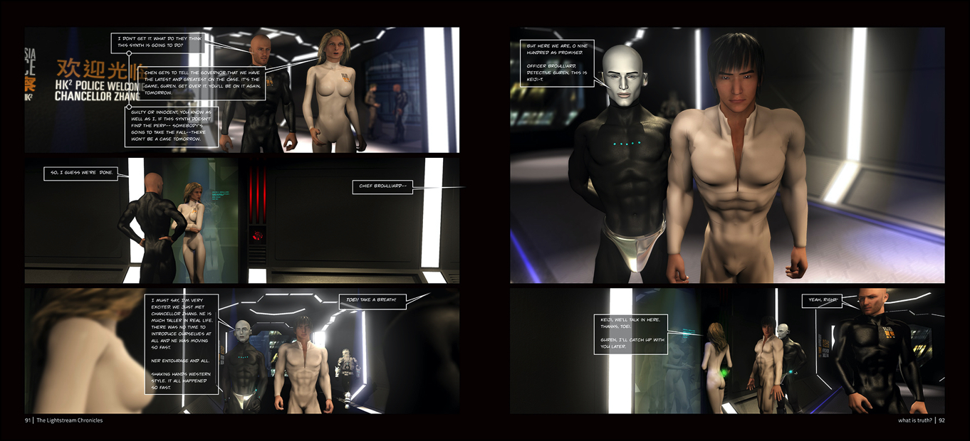 It was some 80 pages ago, that we were briefly introduced to Keiji-T. At last he is back and I can confidently say that the plot thickens. We also discover from Toei’s reaction to meeting Chancellor Zhang, that synths can get excited. It’s an algorithm.